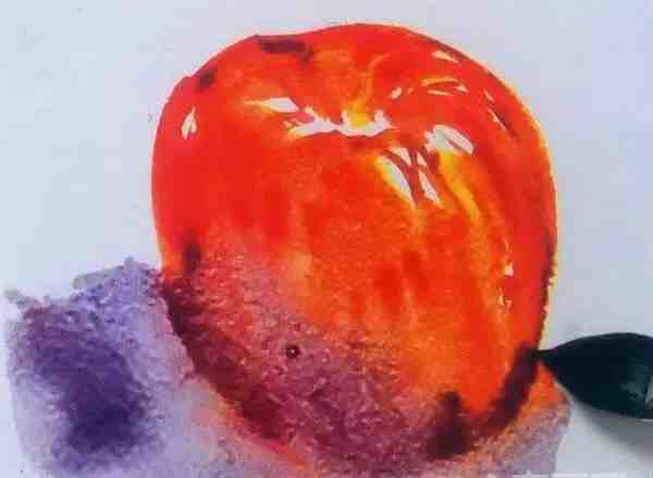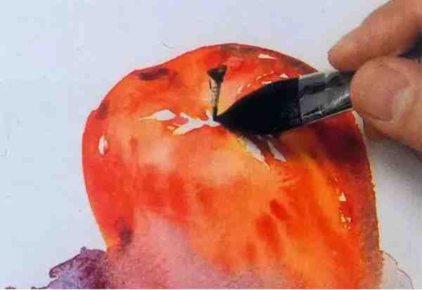 4、使用紫色水彩颜料顺着苹果皮的纹理方向画上几笔,这样可以给人苹果皮裂开的感觉。