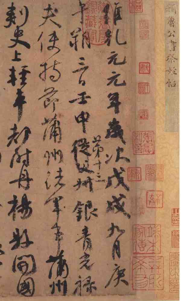 天宝十四年(755年),节度使安禄山发动叛乱。颜真卿闻讯,立刻联络长兄颜杲卿起兵抵抗,十七郡纷纷响应,加人讨安大军。当时颜真卿守太原,其兄颜杲卿和子季明守常山。后来,安禄山围攻常山,叛军抓住颜季明以要抉颜杲卿弃城投降。他坚决不肯,目睹儿子被杀,悲痛欲绝。后来城破,颜杲卿大义凛然,以身殉国。颜真卿得知,泣不成声,写下被后人赞誉为天下第二行书的《祭侄文稿》,抒发内心愤懑悲痛之情。
