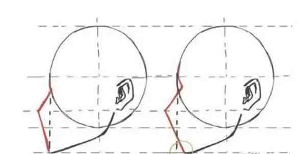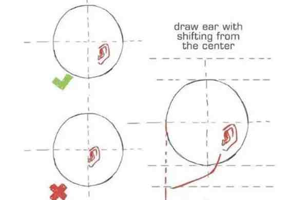 3、根据划分的区域,画出人物的耳朵,需注意与十字线的边距,并完成脸部弧度的绘制。