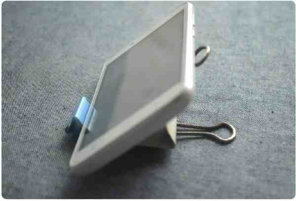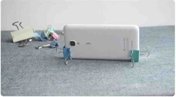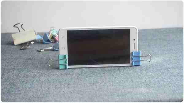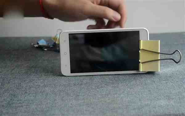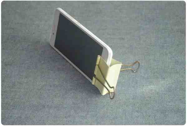 首先准备两枚小号的长尾夹,然后将它夹在手机同一水平面的两端,最后再将手机背面的长尾夹手柄都向外推,让长尾夹与桌面形成一个三角形。这样就能稳定手机的平衡了。