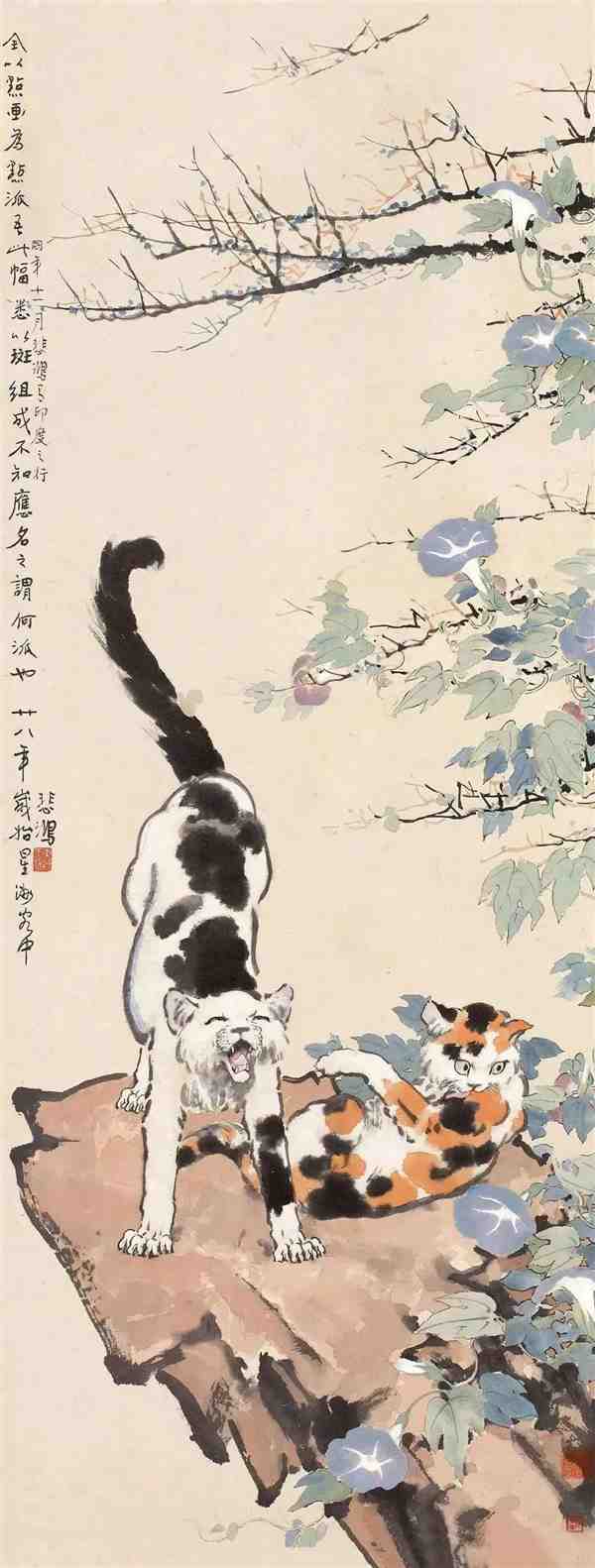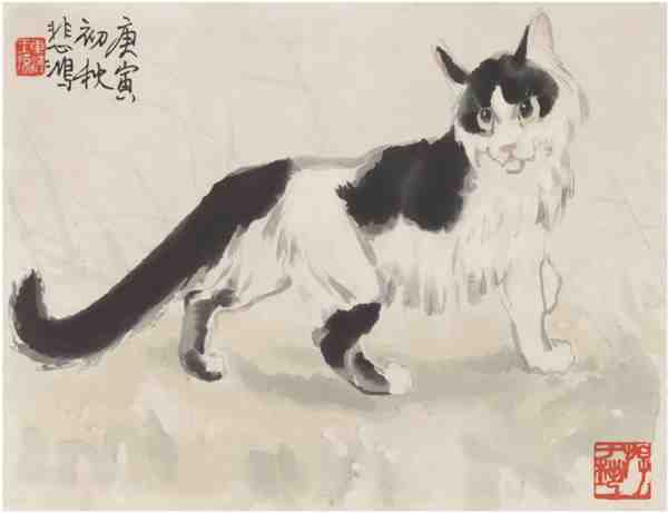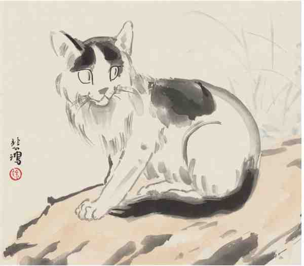在徐悲鸿的众多作品中,禽鸟畜兽题材占据了相当大的比重,其中“猫”更是他钟爱的绘画对象。他热爱猫,养猫、画猫,甚至常常以“猫”作为赠品,赠送给友人,这其中就包括了徐志摩、胡适、吴湖帆、张大千等文化名人。每当有人称赞他的马画得好时,他总是幽默地自诩:“人家都说我的马好,其实我的猫比马画得好。”