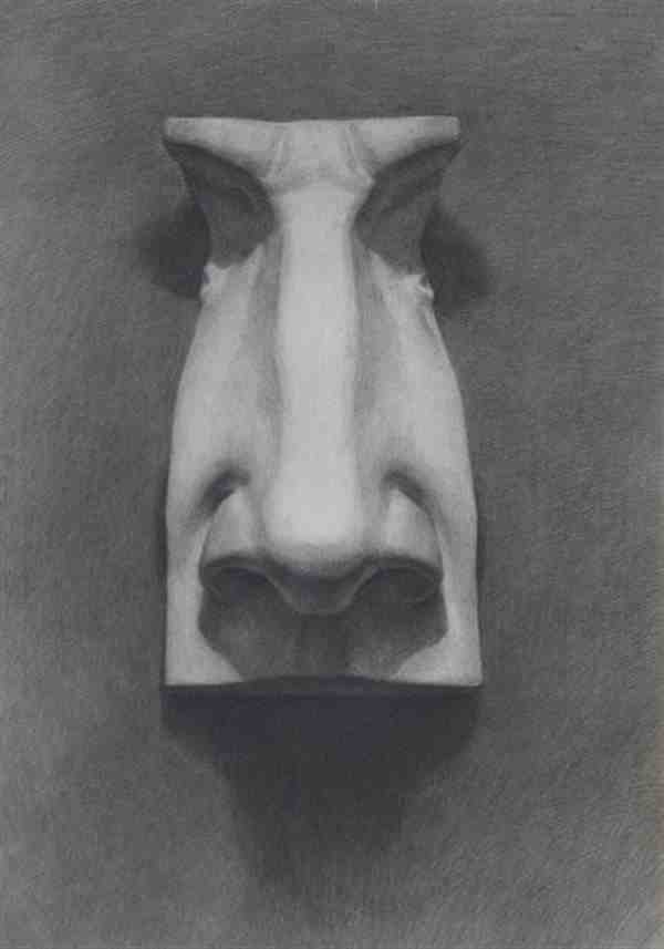 鼻子从生理结构上分为:鼻梁、鼻翼、鼻头、鼻孔、人中。从物理结构分为:鼻梁正面及两个侧面,鼻头、笔底。将人物鼻子做成石膏像,单独拿出来画。学习块面分析,认识各各面的朝向对于画明暗关系很有帮助。今天来赏析一组多角度的石膏鼻子素描图片。