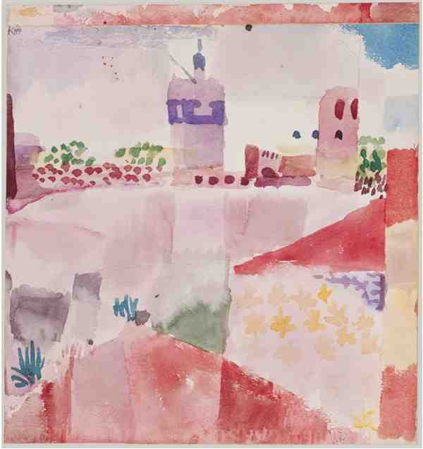 1914年,保罗·克利踏上了北非突尼斯的旅程。那里的阳光如同神灵赐予的灵感,让他对颜色有了全新的领悟。他用水彩绘制了《哈玛迈特清真寺》,将表象性与非表象性的元素巧妙地并置在同一画面之内。画的上半部分,清真寺的轮廓在高塔与树的映衬下显得庄严肃穆;而下半部分,城墙几乎占据了画面的三分之二,克利则以化开的半透明色块来表现,这种手法受到了罗伯特·德劳内的启发。