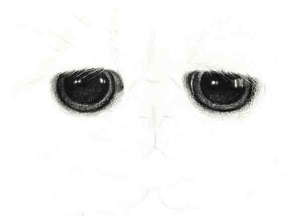 二、彩铅画动物教程:第二步我们对大脸猫的眼睛进行彩铅画的上色,我们仔细的看一下画好的大脸猫的眼睛的部分,需要用到的有黑色的彩铅笔,这里我们将大脸猫的眼睛分成两个部分来画,眼睛眸子的中心部分和眼睛眸子的边缘部分,眸子的中心部分颜色要深一些,边缘部分的颜色浅。