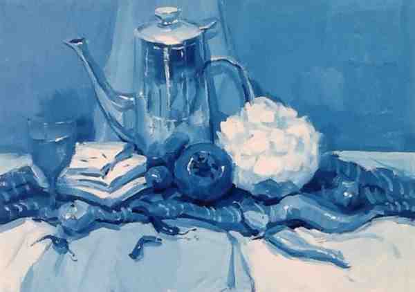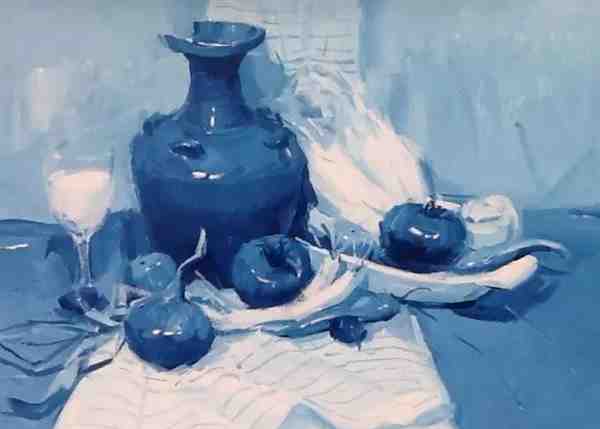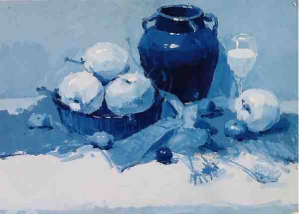为此,先进行单色写生练习,是较有效益的。因为是单色练习,不需考虑色彩变化,作为由素描到色彩的过渡,可为色彩与素描在画面上的结合以及色彩写生打下基础。经几次单色练习后即可练习静物色彩写生。