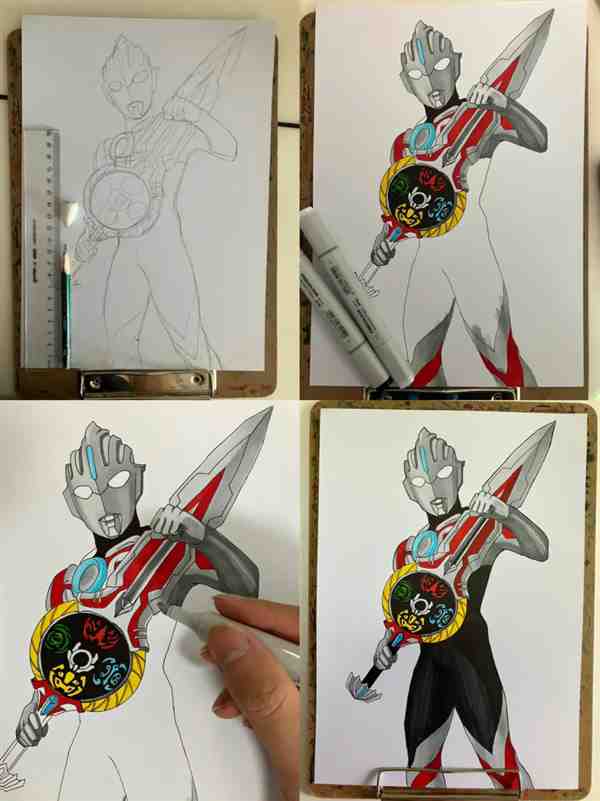 Step 8.着色:最后,根据奥特曼的主题颜色,为欧布圣剑涂上相应的颜色,如红色、银色等。