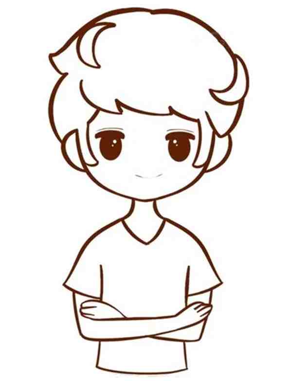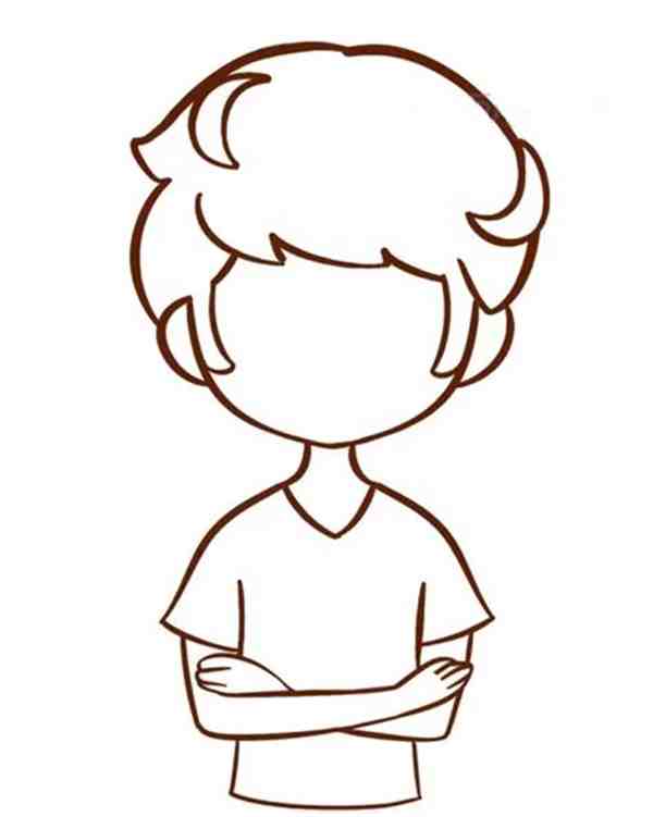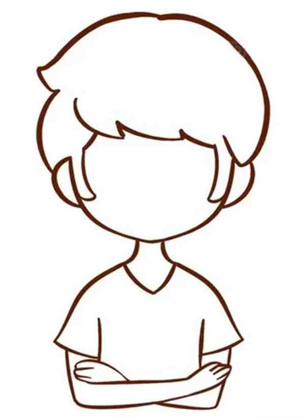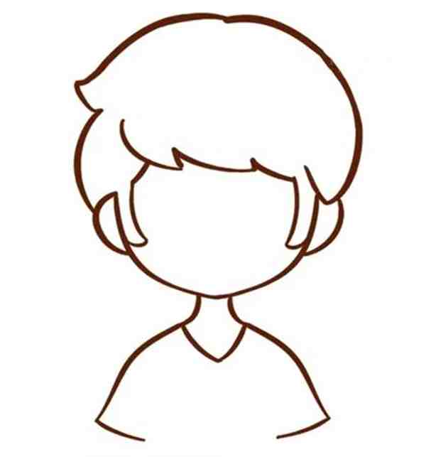 4、画好了小男孩的头部轮廓了,我们当然要给他加上身子。照着下图画出脖子和短袖,小男孩的上半身就有个大概轮廓了。
