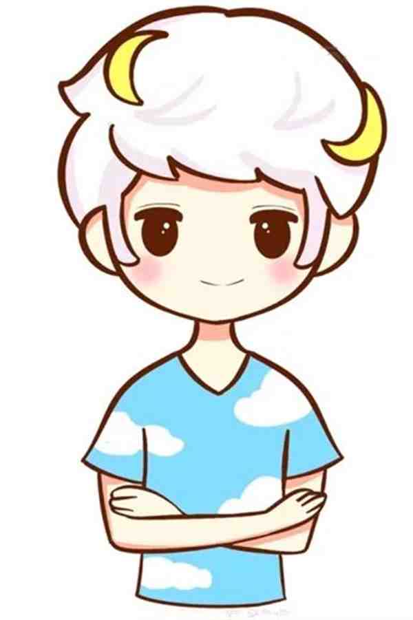 6、画好手臂后,我们再把衣服的下半截补上,这样就是一个完整的上半身啦。顺便给小男孩的头上画两个弯弯月牙做装饰。