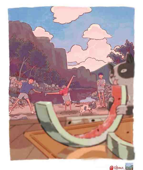 oheat01笔下的童年主角有三个人,描绘的也是三人的日常,一起吃西瓜,一起游泳,一起做游戏,童年的无忧无虑被他完美的展现出来,他的笔触细腻、柔软,色调多是暖色调,带有很强的治愈性,也能让人们在看画过程中,回忆自己的青葱岁月。